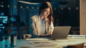 Professional man reading tax news on a laptop in an office environment.